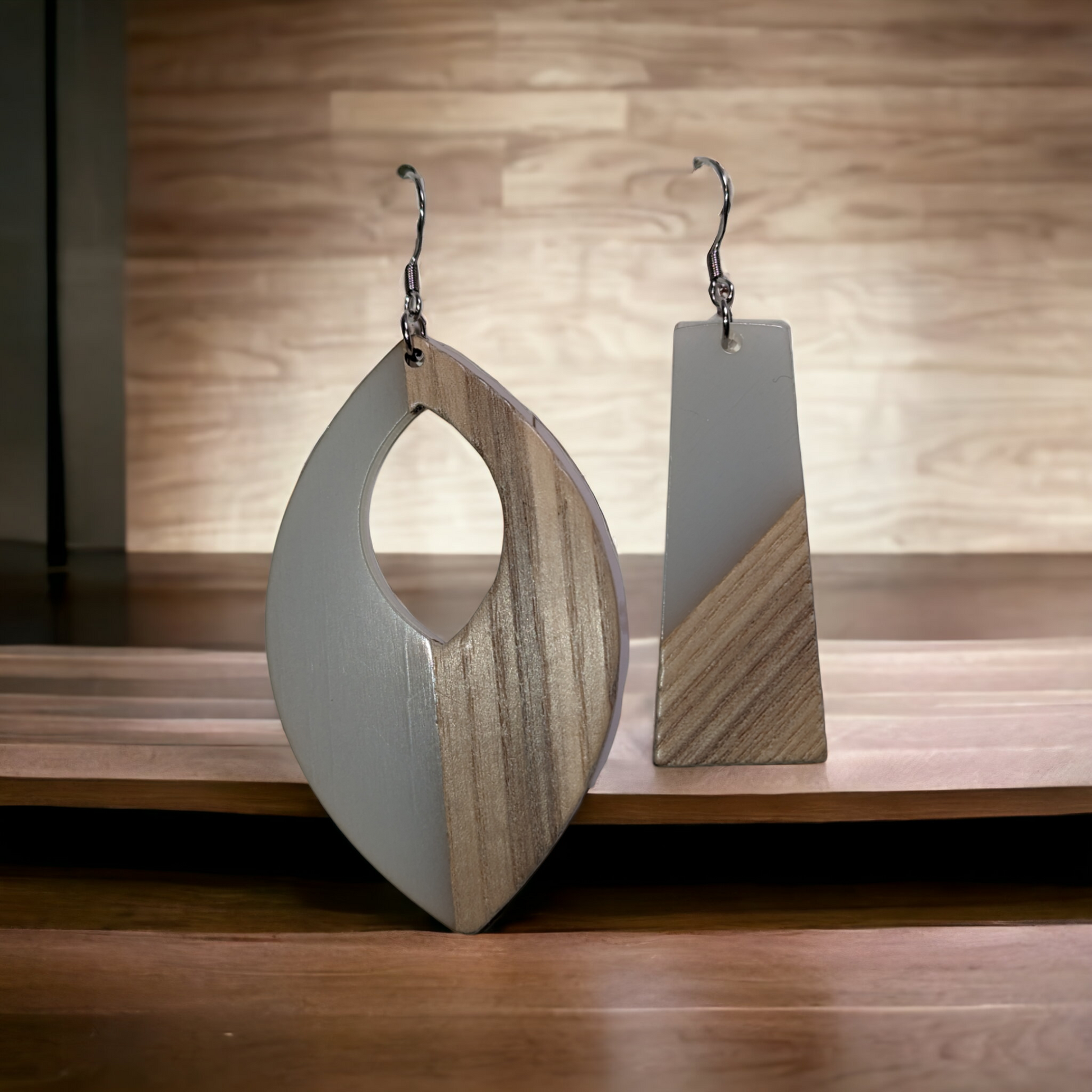 Crochets en acier inoxydable. Pendentifs en bois et en acrylique.
