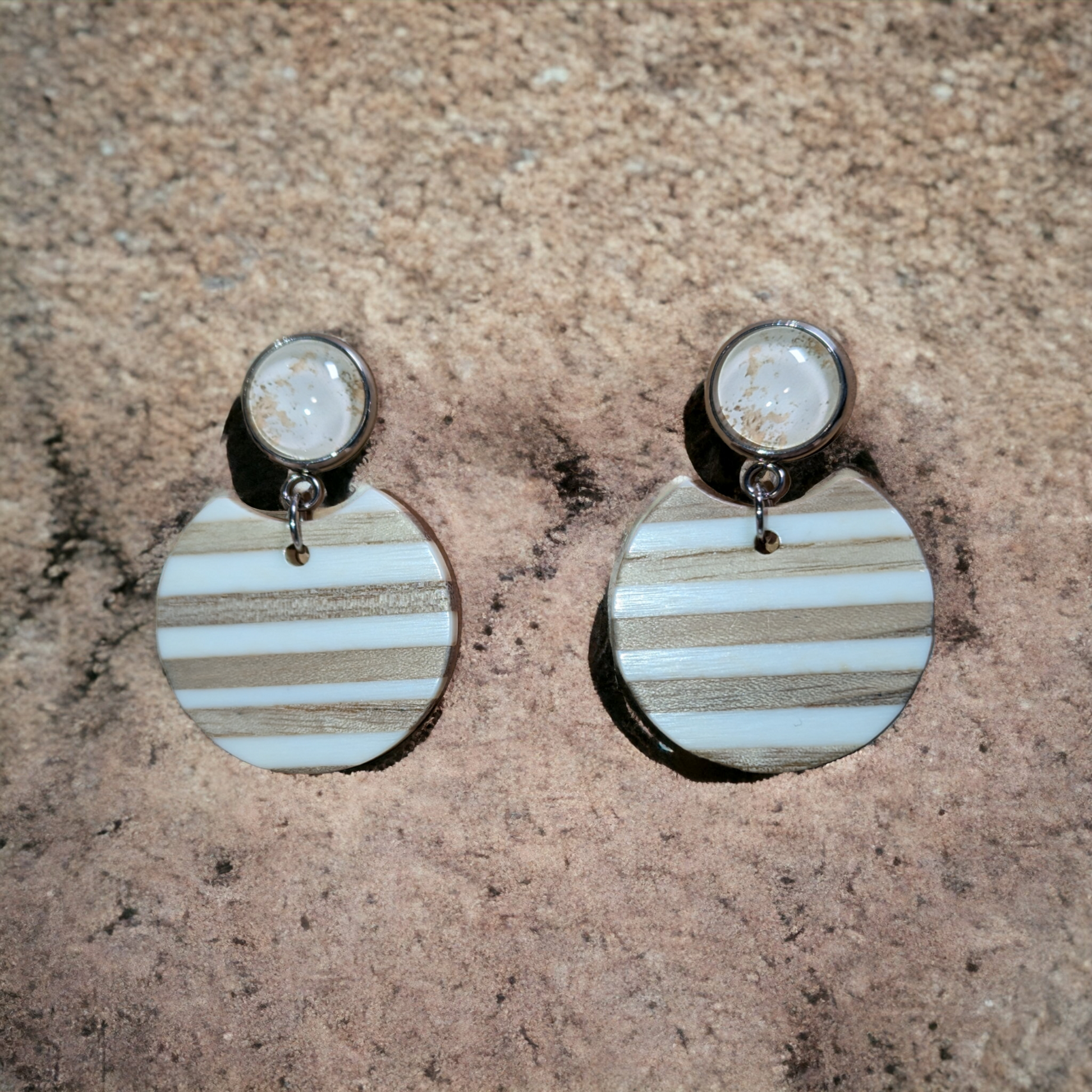 Supports et tiges en acier inoxydable. Pendentifs en bois et en acrylique. Cabochons en verre.