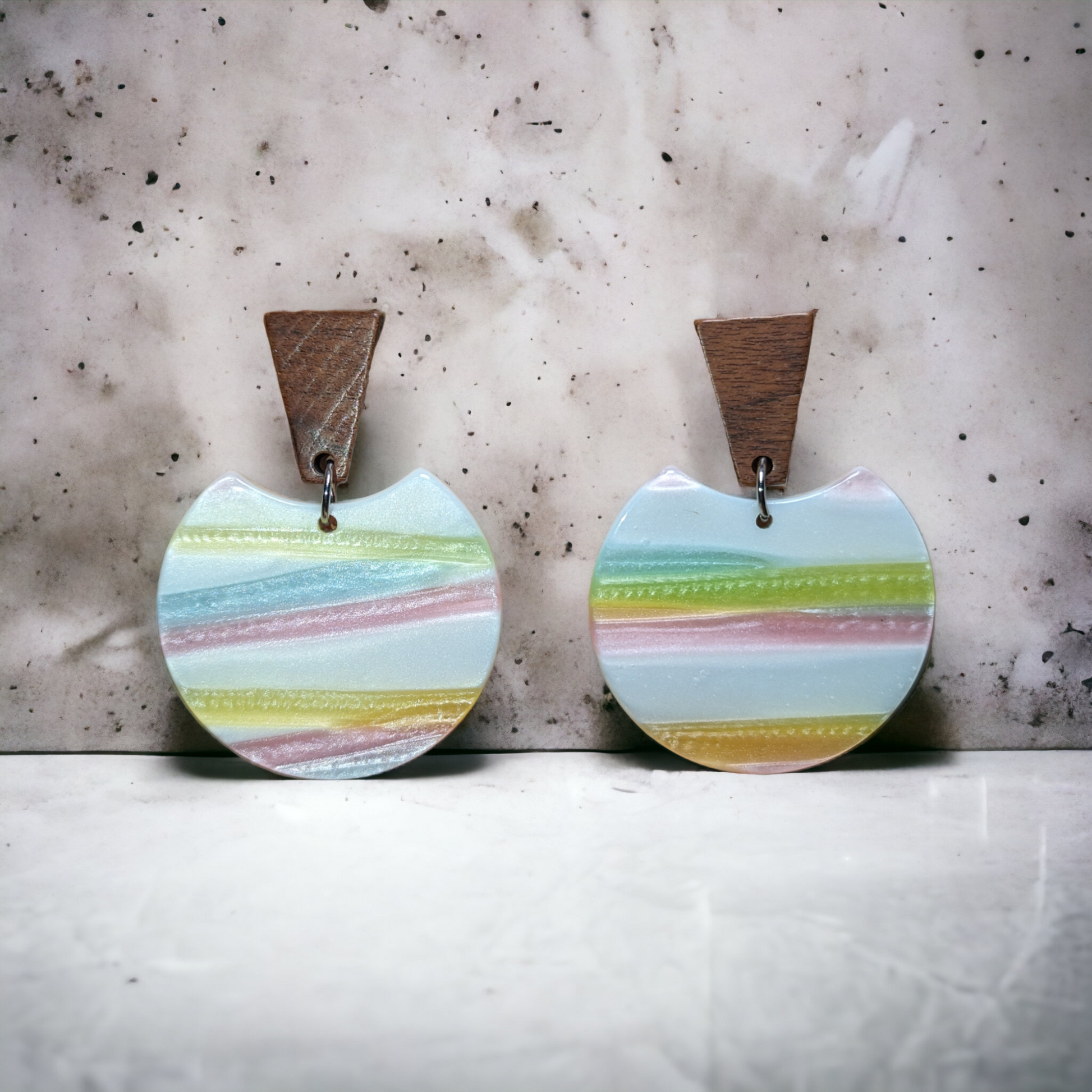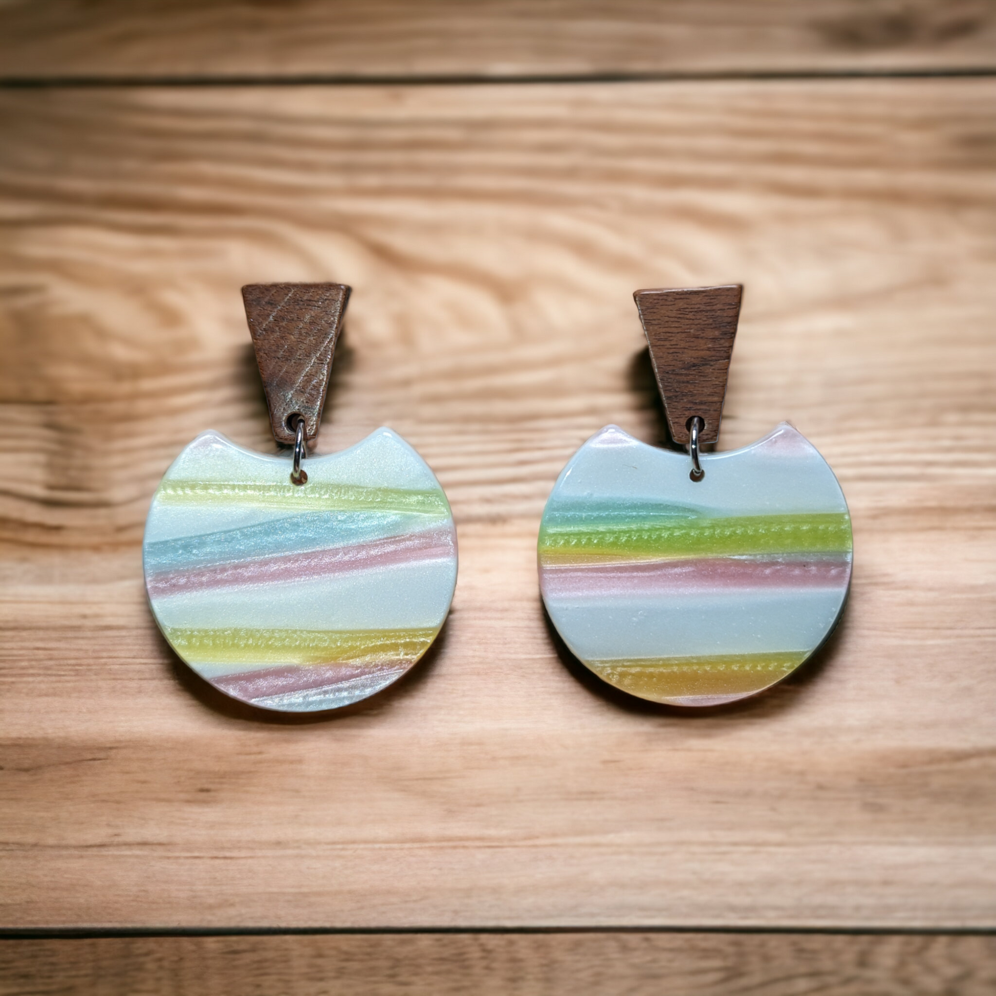 Puces en bois et tiges en acier inoxydable. Pendentifs en acrylique.
