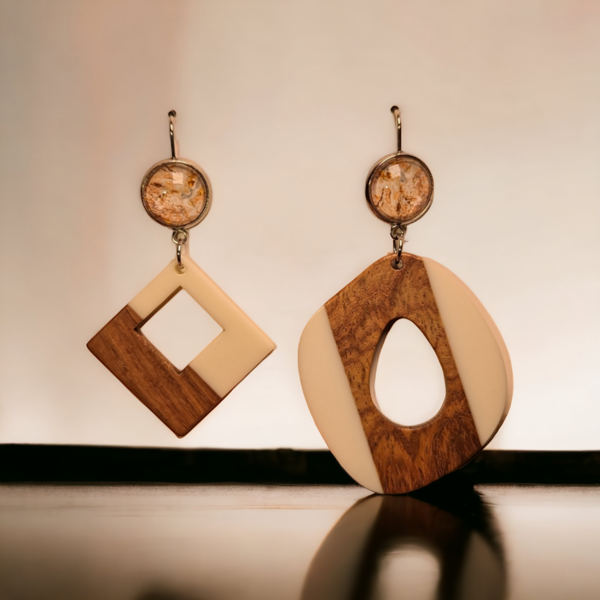 Crochets d'oreilles et supports à cabochons en acier inoxydable. Cabochons en verre 12mm. Pendentifs en bois et en acrylique.