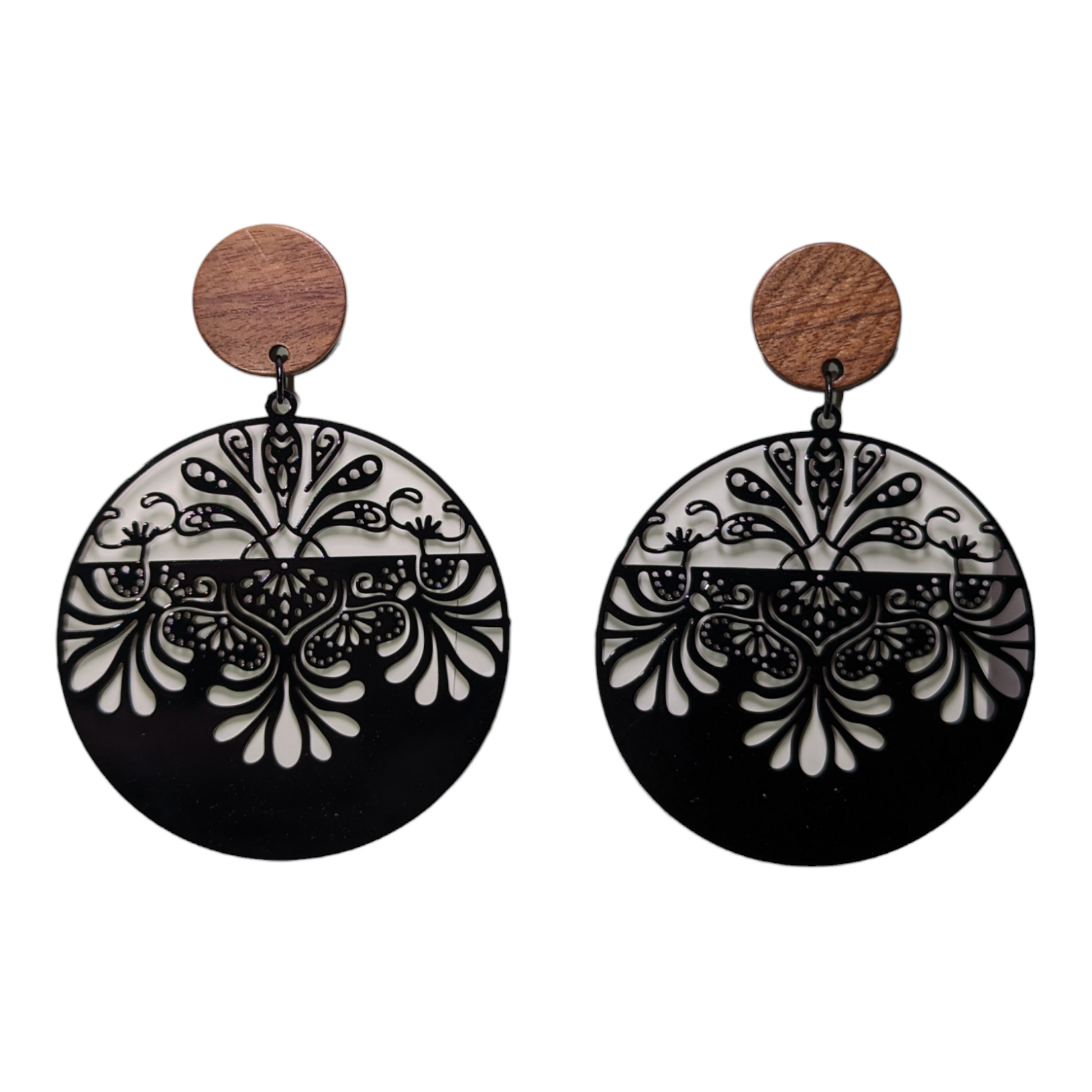 Puces en bois avec tige en acier inoxydable. Pendentifs en laiton peint.