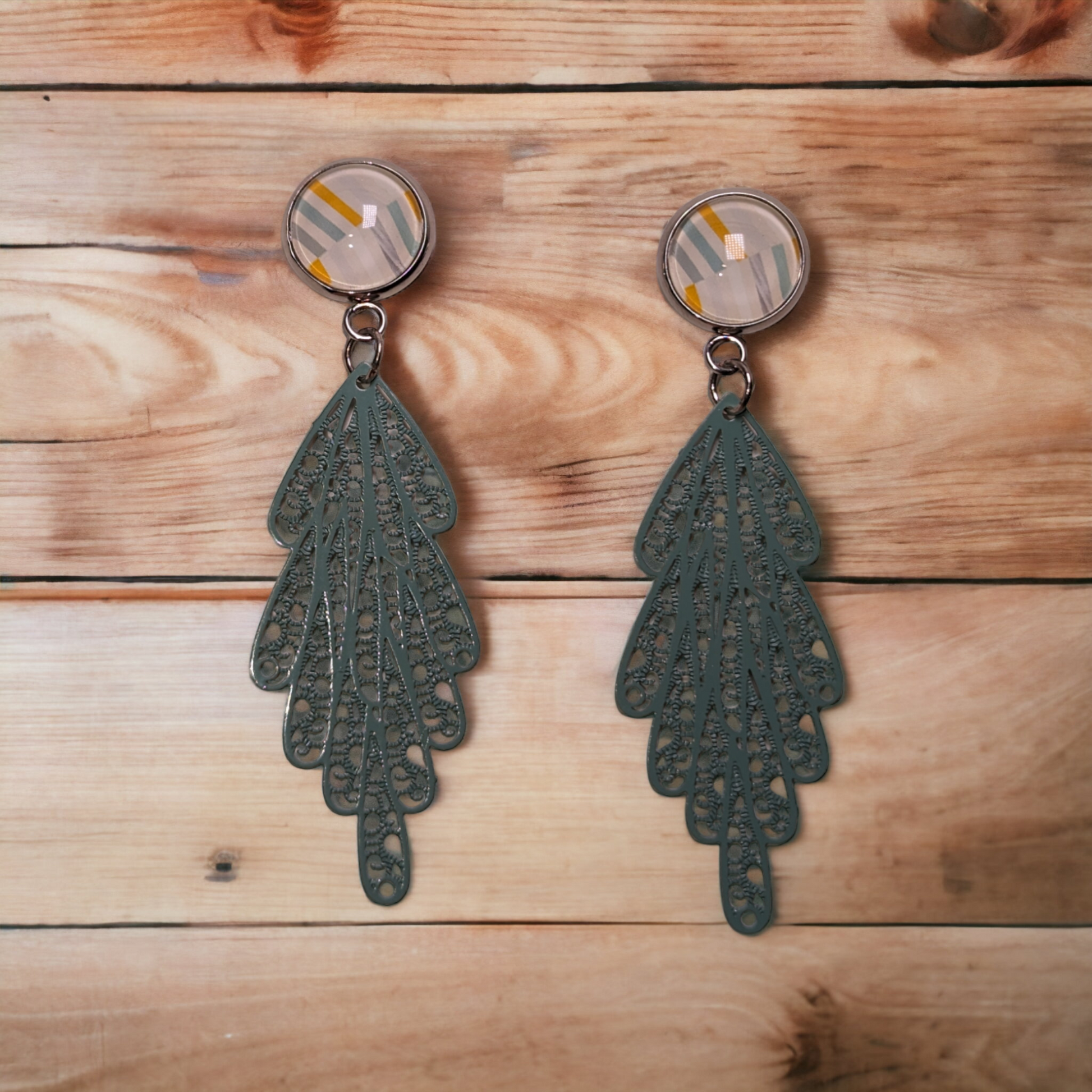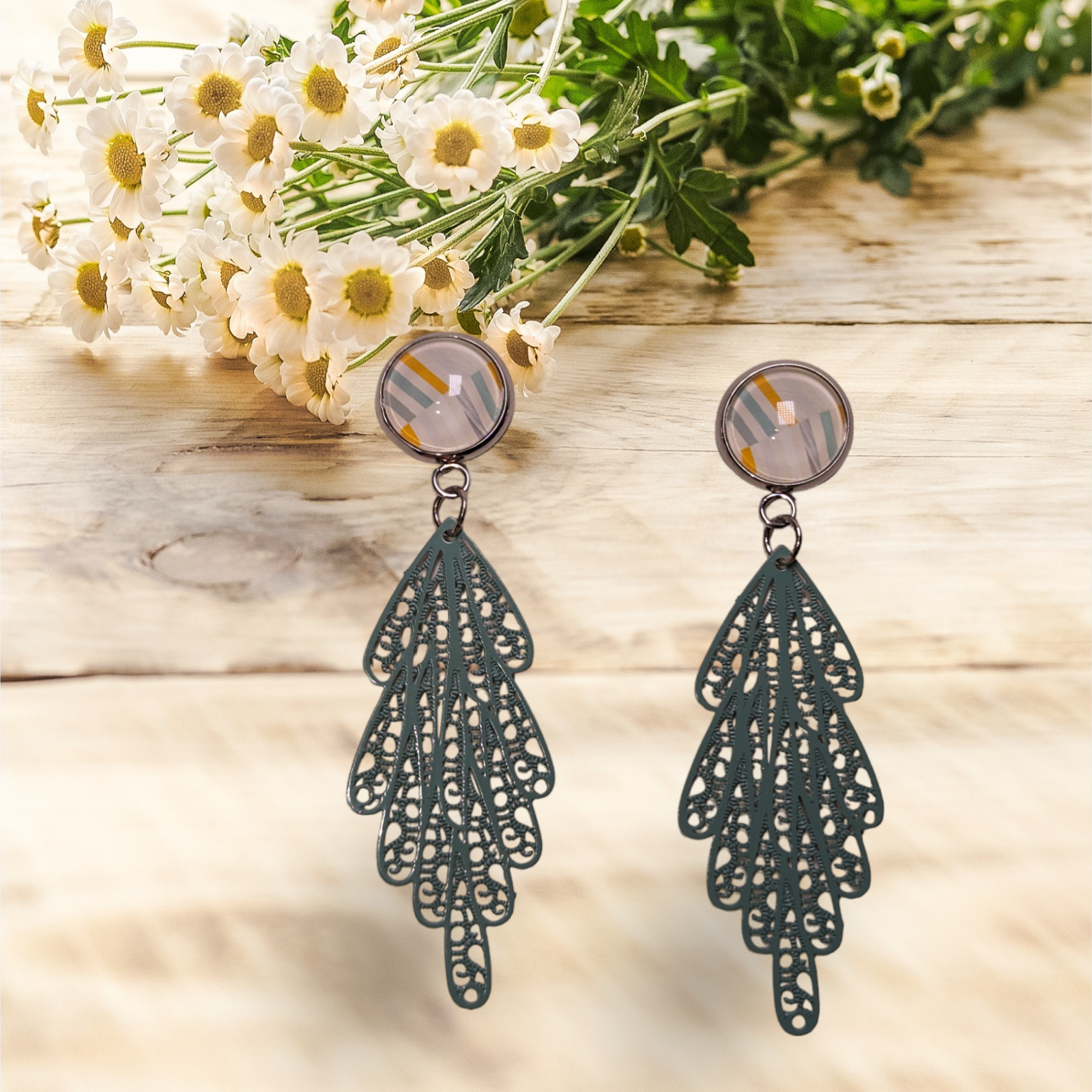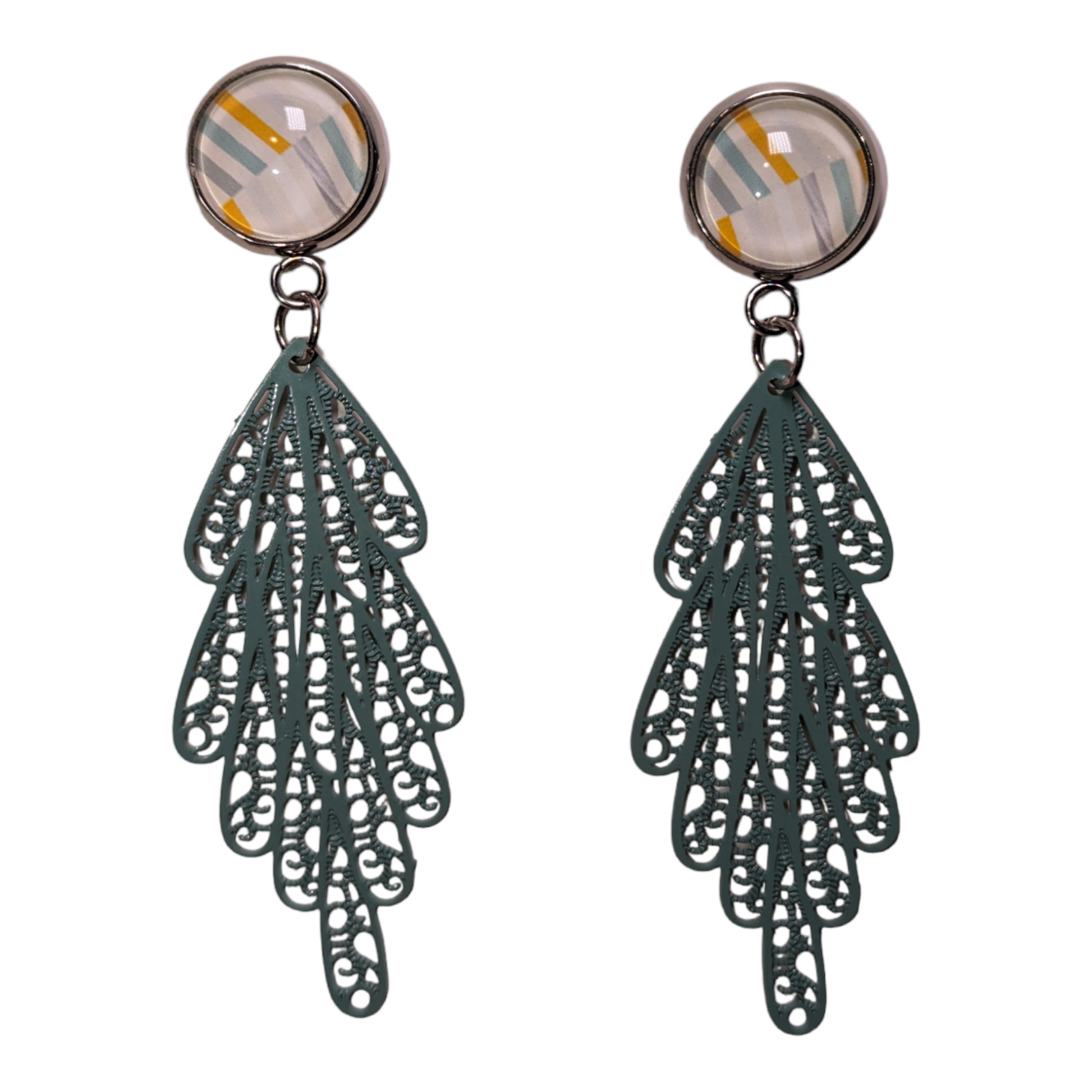 Supports et tiges en acier inoxydable. Pendentifs en laiton peint.