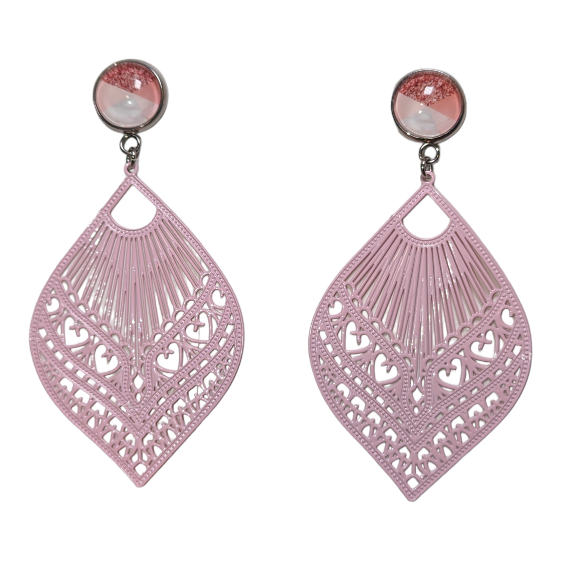 Supports de cabochons et tiges en acier inoxydable, cabochon en verre 12 mm et pendentif en laiton peint de couleur rose.