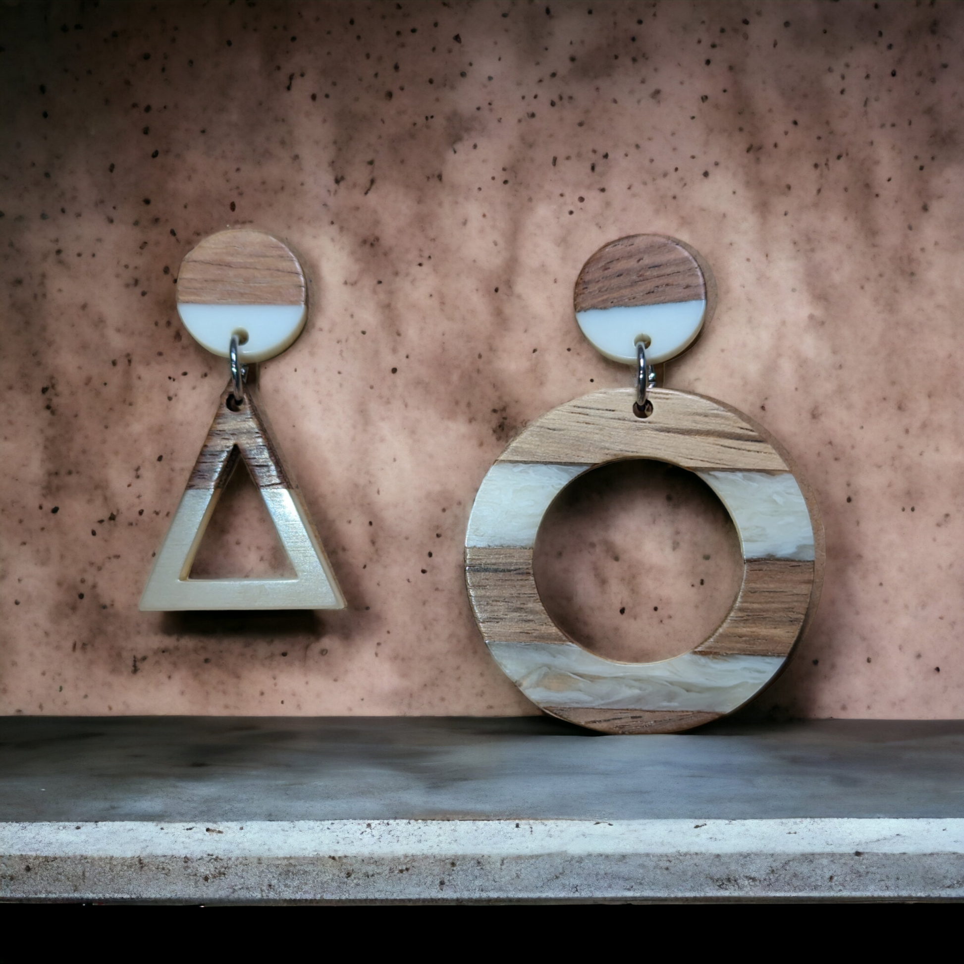 Puces et pendentifs en bois et acrylique. Tiges en acier inoxydable.