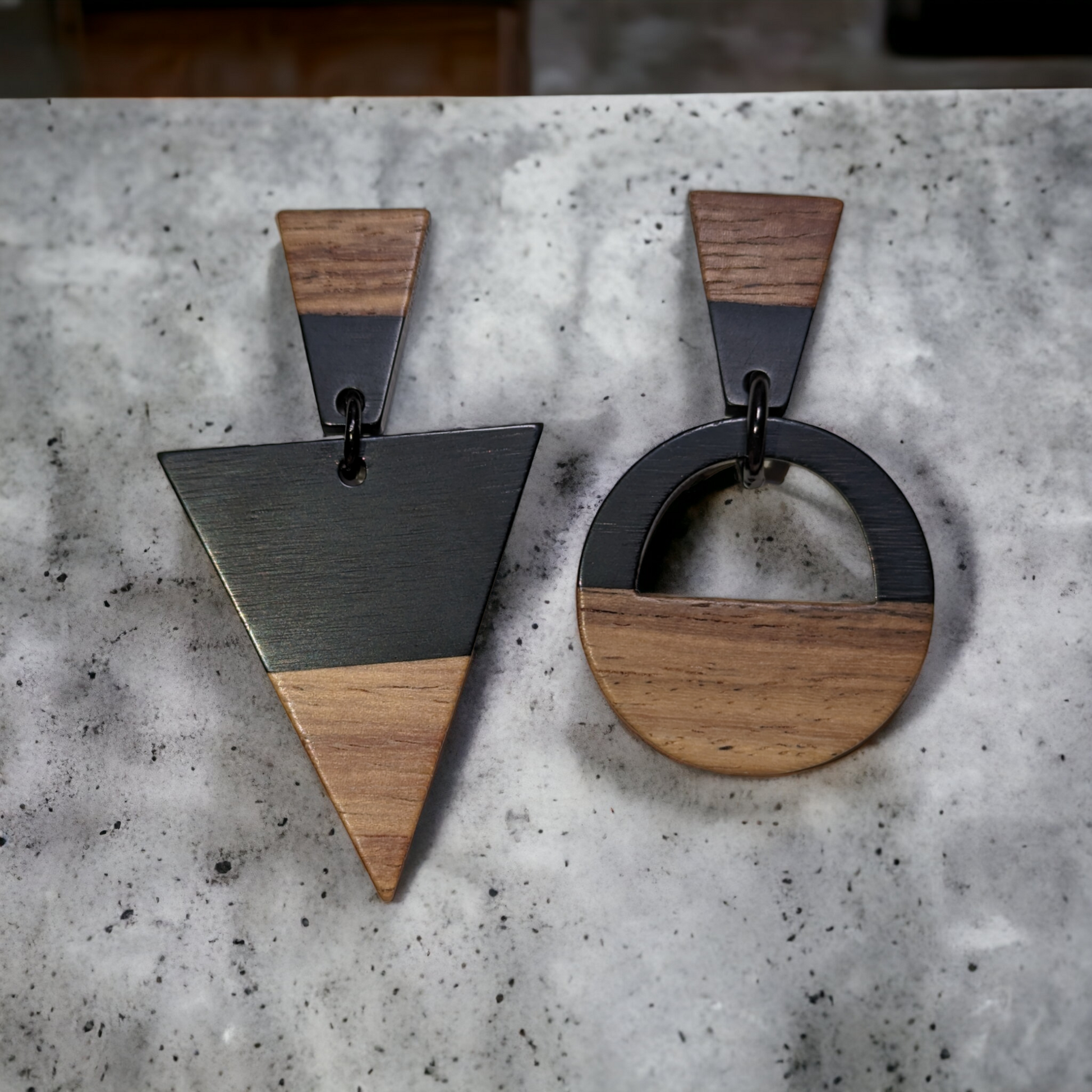 Puces et pendentifs en bois et en acrylique. Tiges en acier inoxydable.