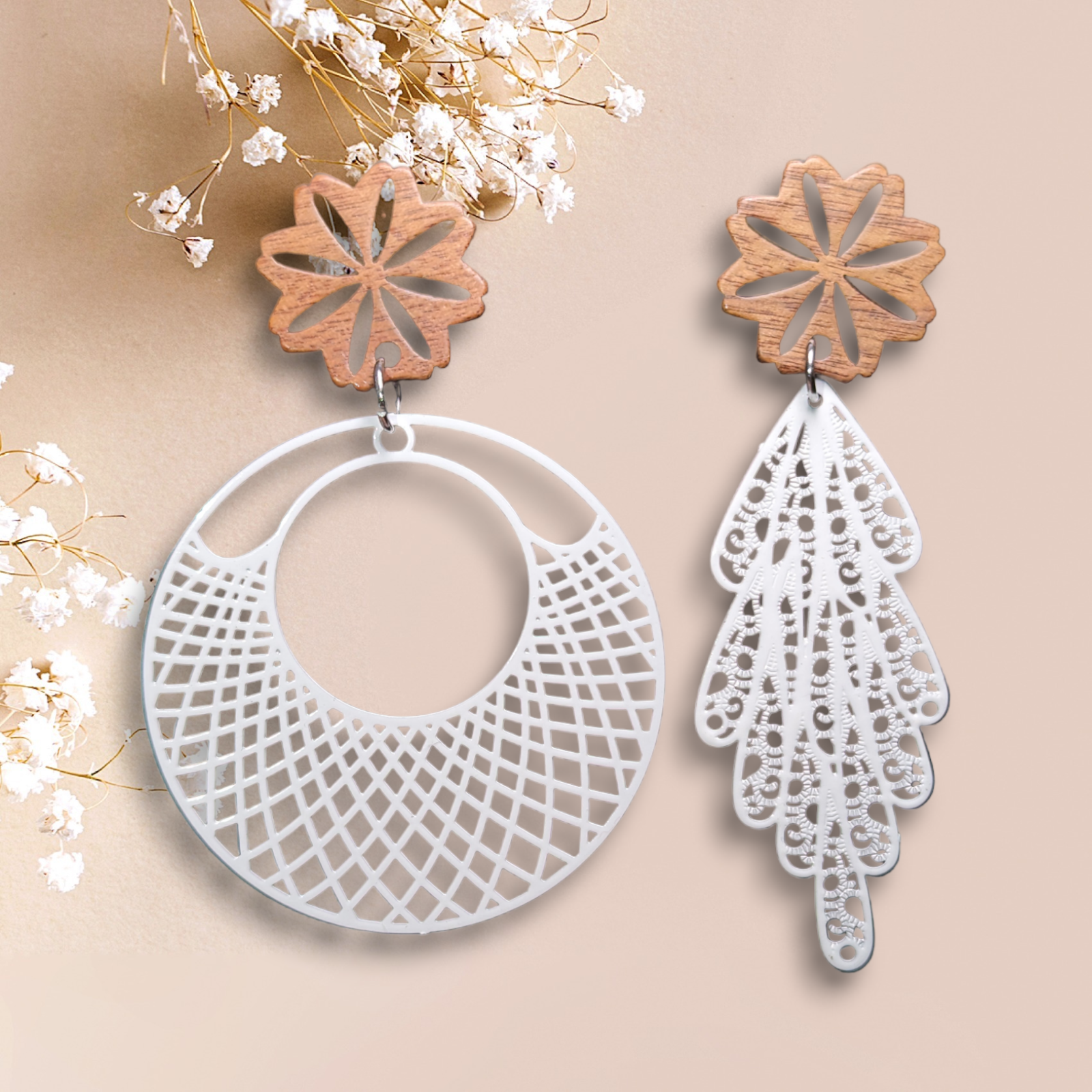 Puces en bois avec tiges en acier inoxydable. Pendentifs en laiton peint.