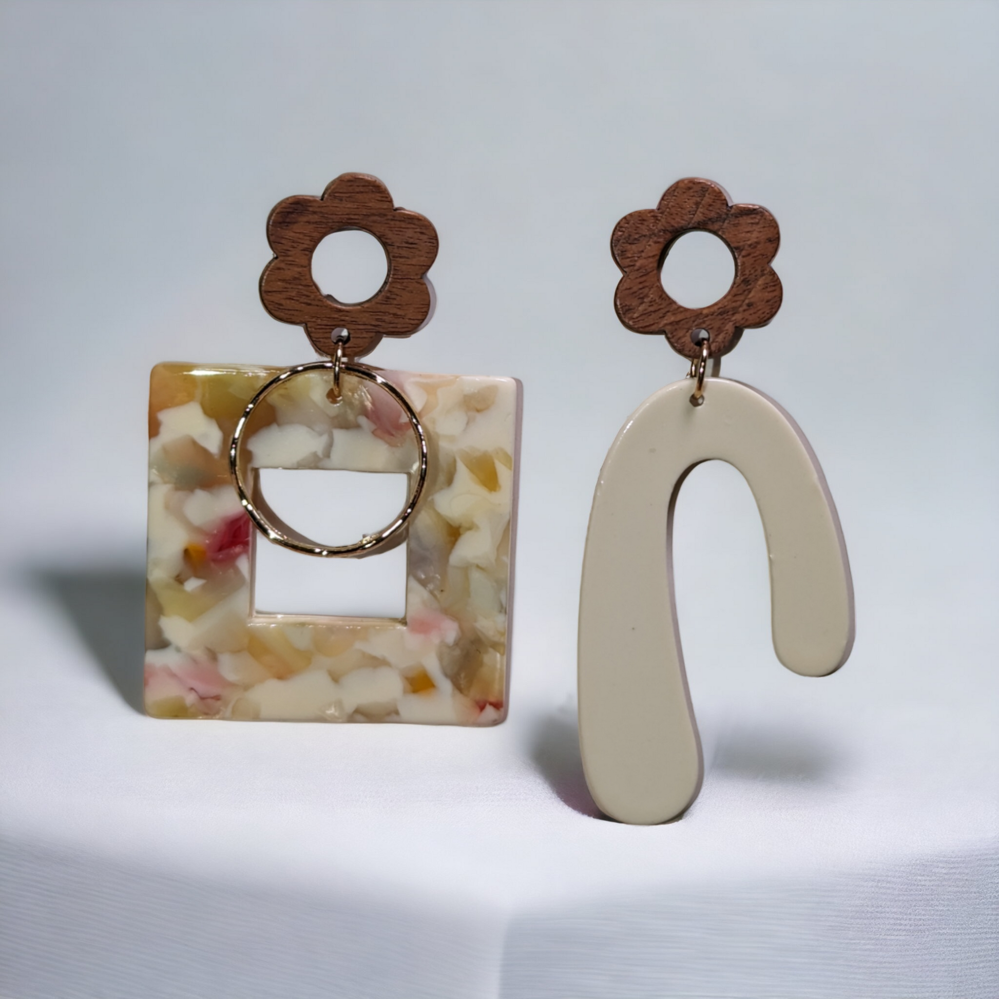 Puces en bois et tiges en acier inoxydable. pendentifs en acrylique et en acier inoxydable.