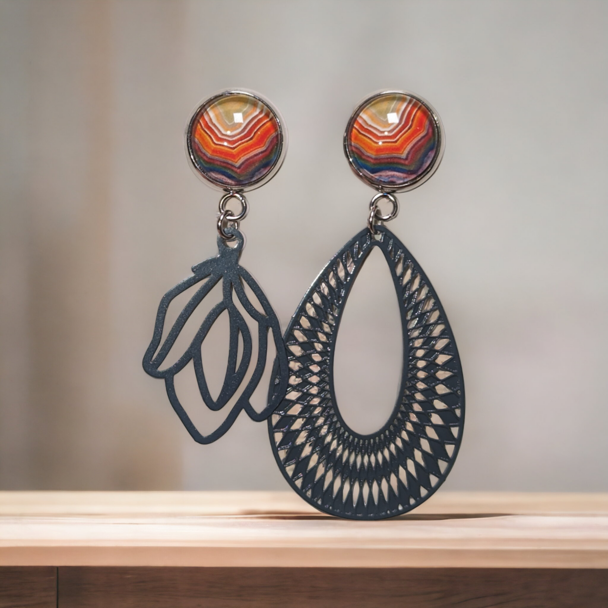 Supports et tiges en acier inoxydable. Cabochons en verre 12mm. Pendentifs en laiton peint.